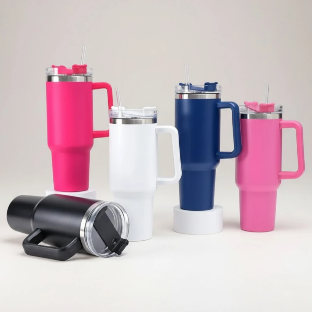 The tumbler features a strong side handle that improves grip and comfort while carrying. The lid includes a straw opening, making it easy to drink without tilting the tumbler. Its tall design allows you to hold more liquid, reducing the need for frequent refills. The bottom shape is designed to be easy to place and hold.