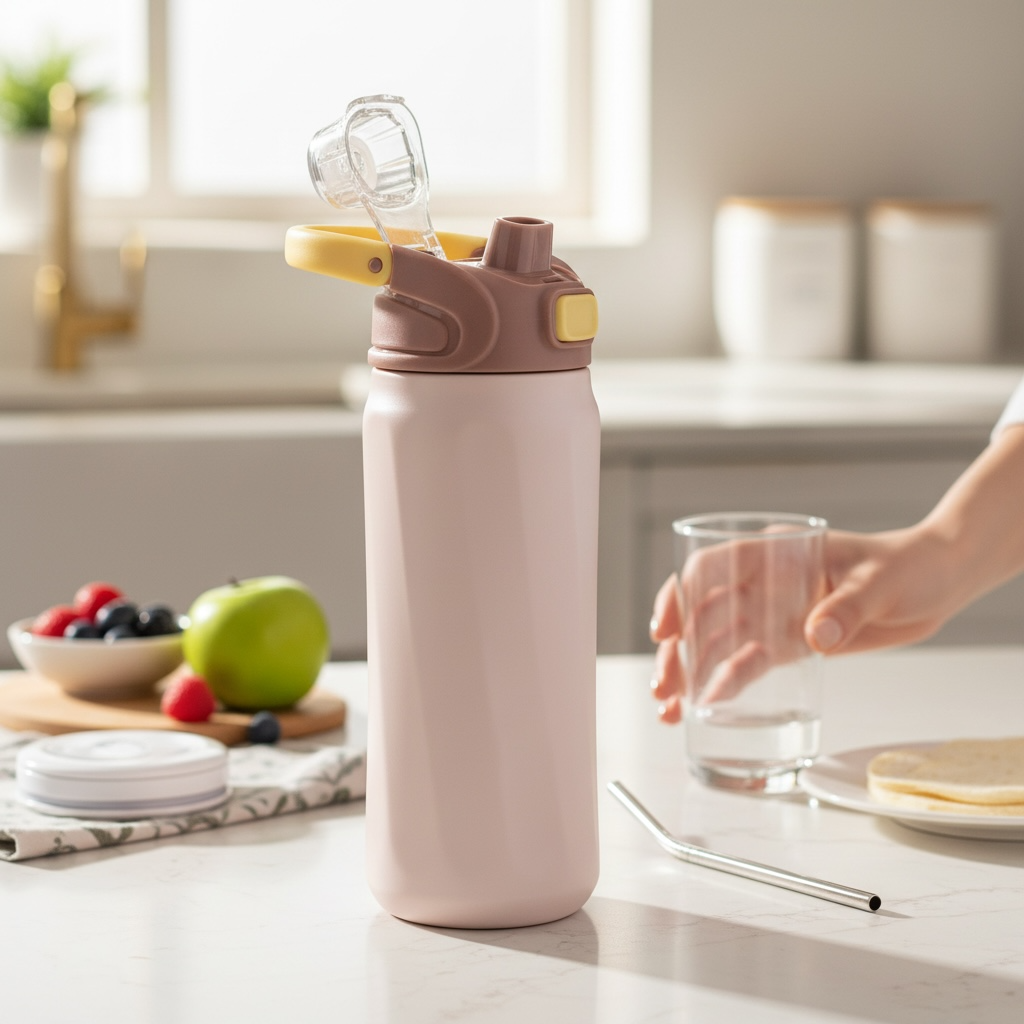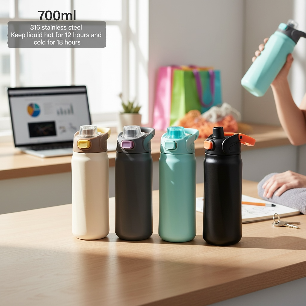 Stylish Variants, Colors & Options We understand that your gear should match your personality. This 700ml model comes in four sophisticated matte finishes: a minimalist Beige, a professional Grey, a refreshing Frozy (mint green), and a classic Black. Each variant features a color-coordinated lid and a transparent spout cover, allowing you to see your drink while keeping the mouthpiece protected from dust and germs.