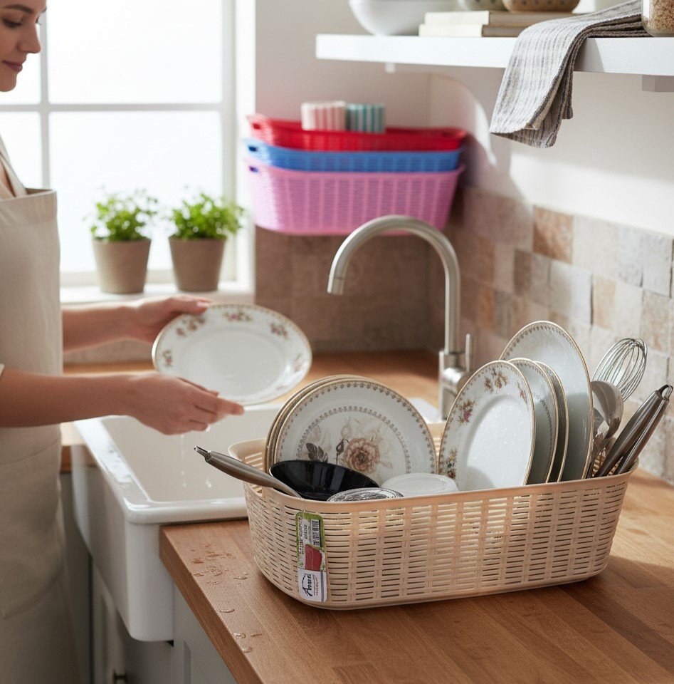 This product excels as a laundry basket, providing a lightweight yet sturdy way to transport towels and clothing to the washing machine. The open-weave design ensures air circulation, which is essential for damp laundry. Furthermore, it is a primary choice for kitchen washed crockery, acting as a reliable Bartan Tokra that allows plates and bowls to air-dry quickly on your countertop. Its multi-purpose nature also makes it perfect for organizing toys in playrooms, helping you maintain a clutter-free home.