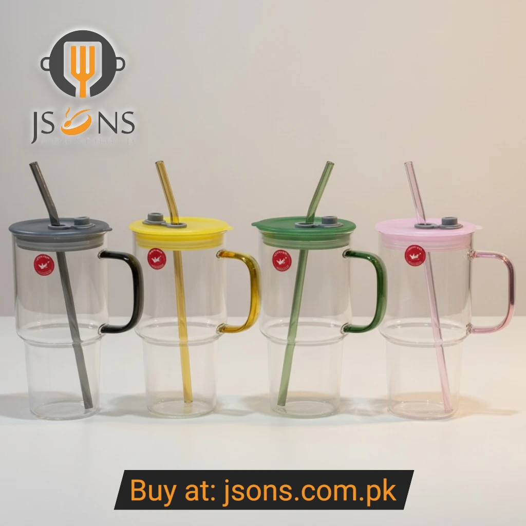 Saath mein colored lid aati hai jo spill se bachati hai, aur ek matching straw bhi diya gaya hai. Yeh set alag alag colors mein available hai — pink, grey, yellow, aur green — toh aap apni favorite rang wala chunn sakte hain ya gift ke liye bhi acha option hai. Handle hona bhi bahut convenient hai especially jab peena hot drink ho.
