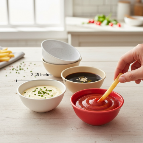 The compact 3.25 inch size makes this bowl easy to place alongside plates or snack trays. It is suitable for single or shared sauce portions depending on use. The rounded shape allows easy dipping of fries and snacks without spills. It can be used individually or in sets for serving multiple sauces at once.