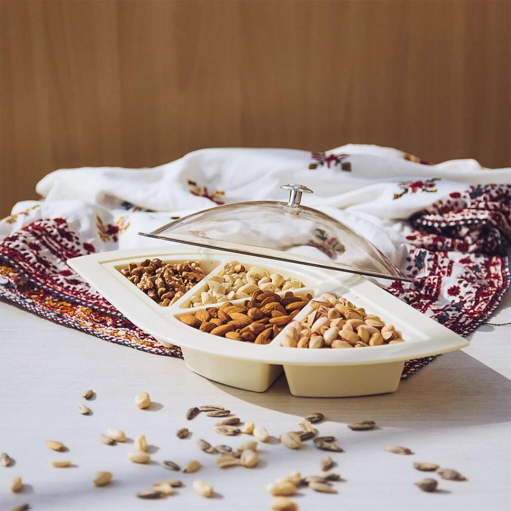 6-Compartment Dry Fruit Tray with Dome Cover ā Elegant Serving Dish for Nuts, Sweets, Snacks & Candy ā BPA-Free Plastic with Transparent Lid