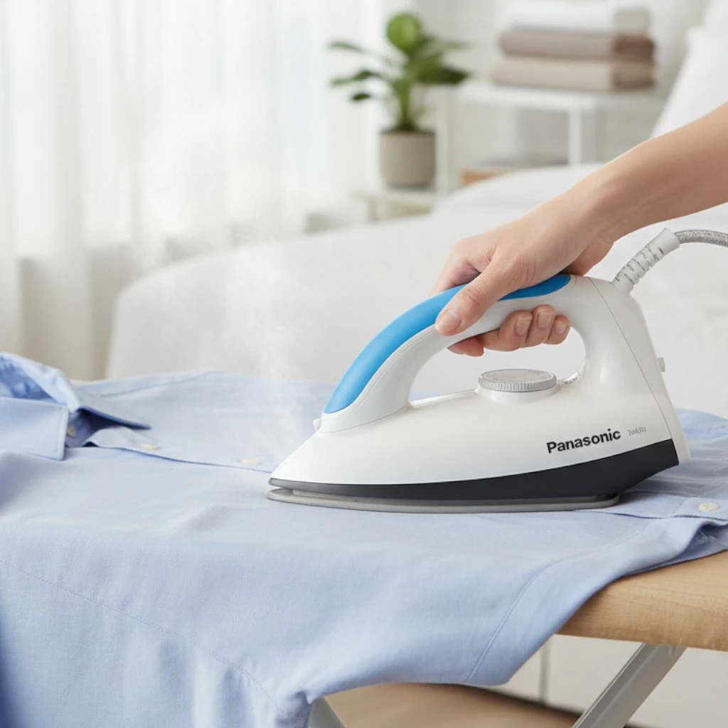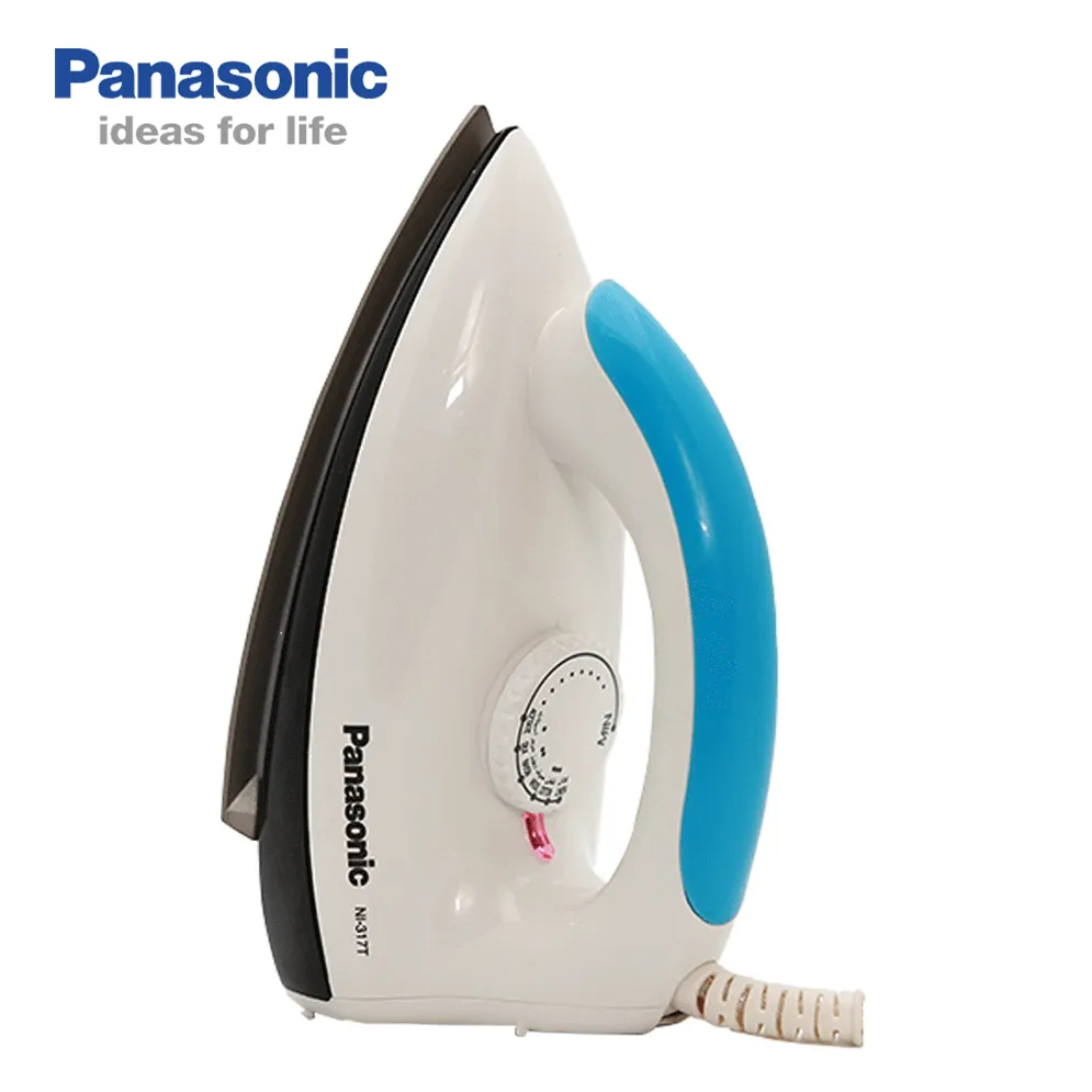 Panasonic 1000W dry iron NI-317T is an electric dry iron designed for everyday clothes pressing. The images and official listing show a compact iron with a non-stick coated soleplate, temperature control, indicator lamp, and a swivel cord — features made for simple, effective ironing at home or in small shops.