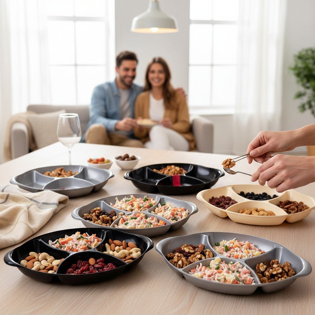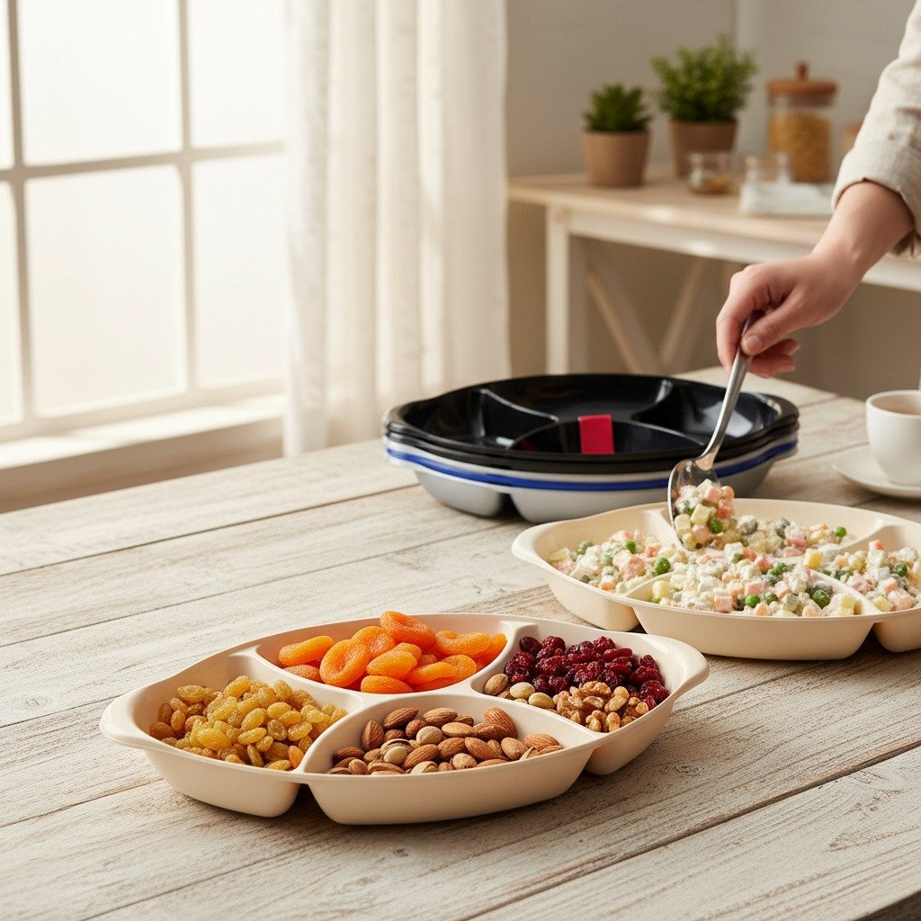 Serving multiple food items together can easily create mixing and mess on the table. The Plastic Partition Tray by Aroni Household provides a simple and practical solution for clean and organized food serving. With clearly separated sections, this tray helps present snacks, dry fruits, salads, or mixed dishes neatly, making everyday serving more convenient.