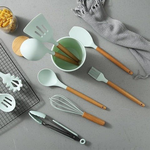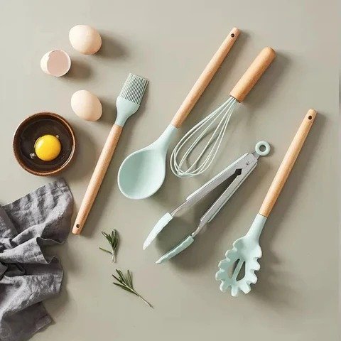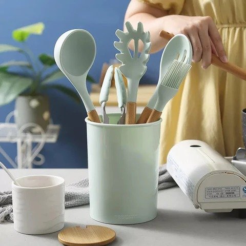Upgrade your cooking experience with this premium silicone kitchen utensils set in Pakistan. Designed for modern kitchens, this 12-piece set includes all essential tools you need for cooking, baking, and serving. The elegant mint green color with a stylish holder adds a fresh and aesthetic touch to your kitchen.