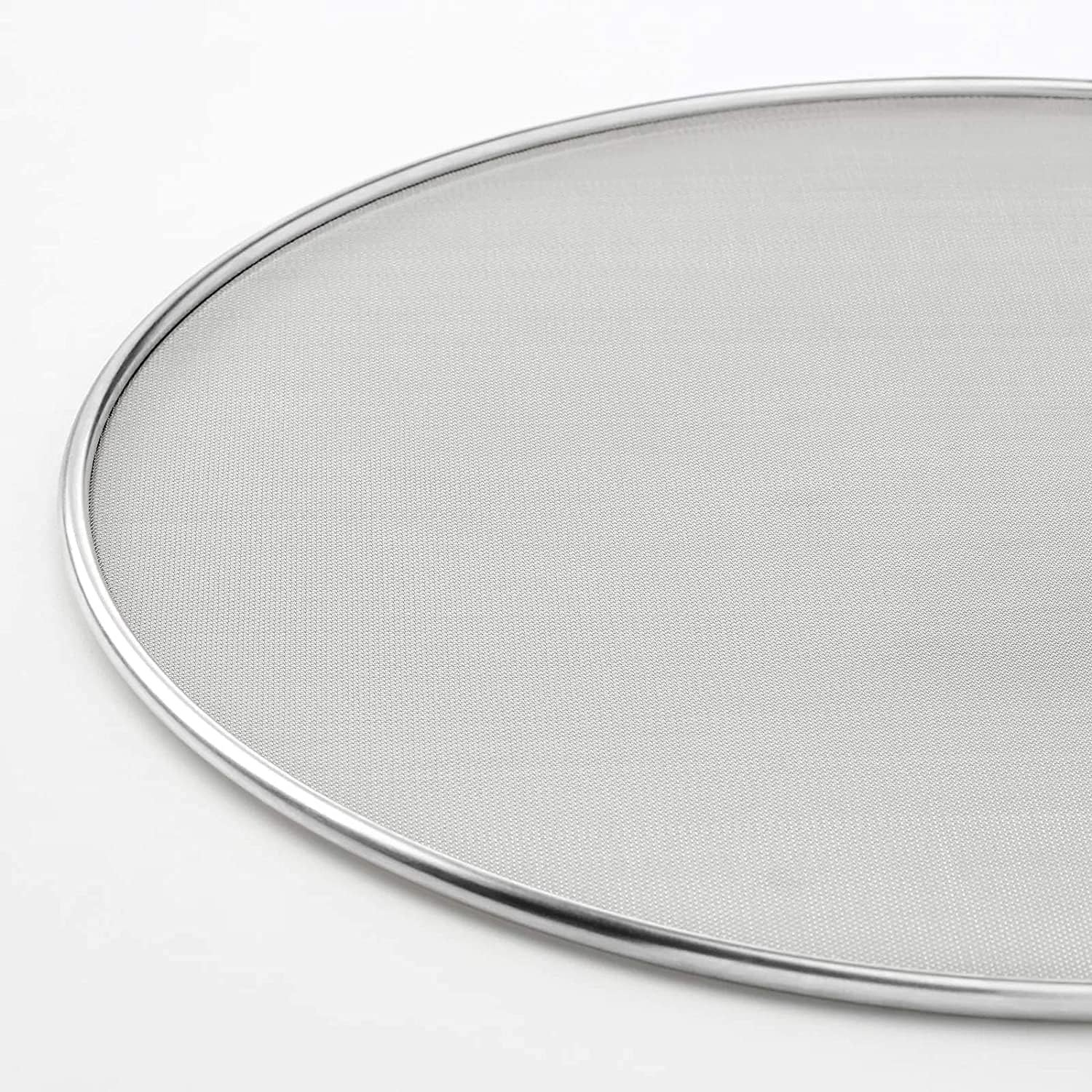 The product features a stainless steel mesh with a solid metal rim and handle. The mesh structure is designed for repeated kitchen use. The metal construction gives the screen a firm shape and stable handling while placing or removing it from the pan.