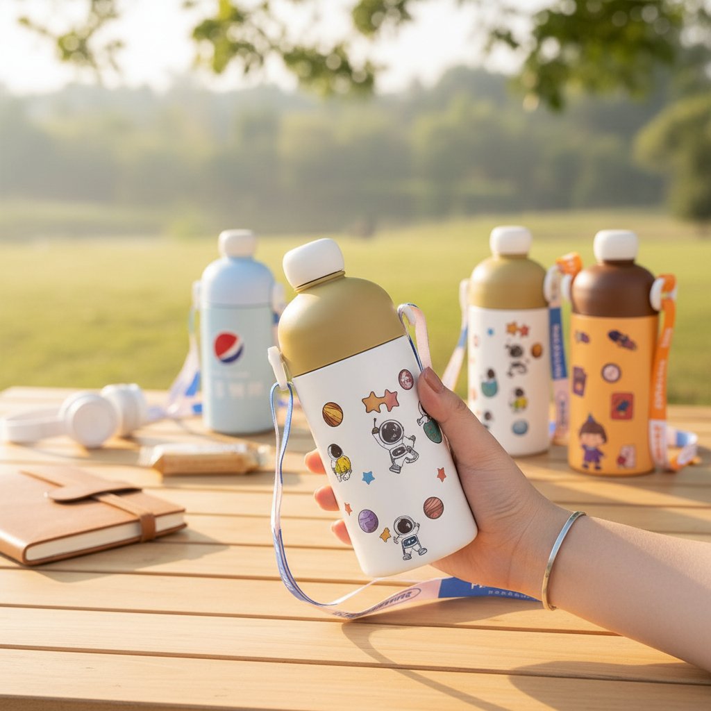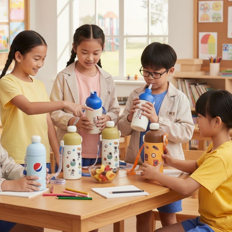 We offer four stylish and modern color options to suit every child’s personality: vibrant Orange, classic Blue, refreshing Green, and minimalist Beige. Each variant comes decorated with unique, high-quality graphics—including astronaut themes and cute characters—to make hydration fun. The 500ml capacity is the “Goldilocks” size for students: enough to last through several periods without being too heavy for a child to carry.
